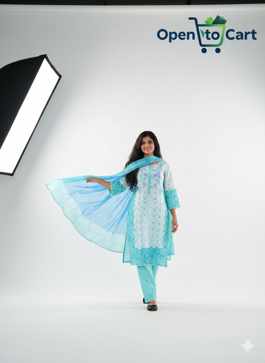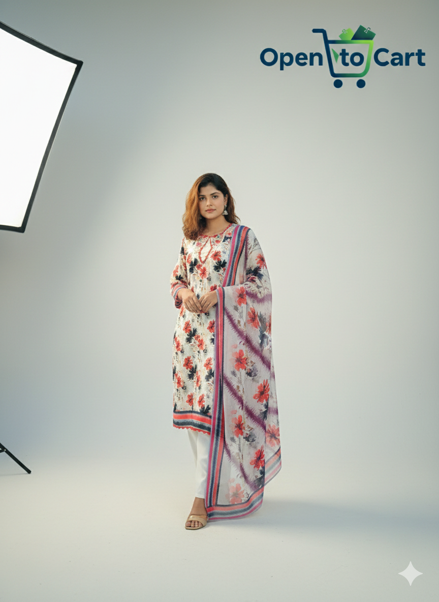 - Dupatta: ম্যাচিং সফট ওড়না – আইভরি বেজে মাল্টিকালার প্রিন্ট