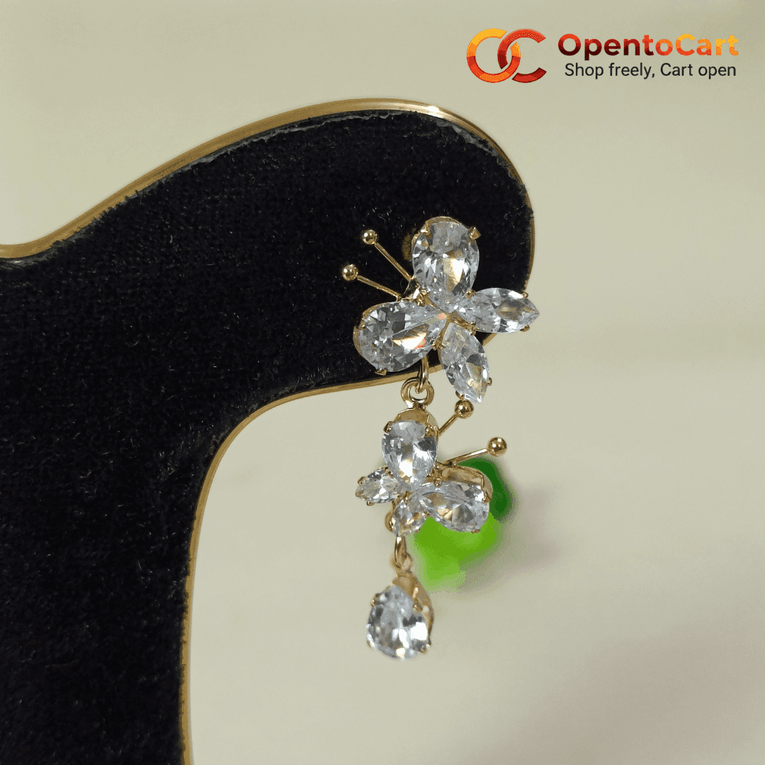 ঝকঝকে ডায়মন্ড কাট পাথরের কারুকাজ এবং বাটারফ্লাই ডিজাইনের কম্বিনেশনে তৈরি এই গর্জিয়াস ইয়ারিংস আপনার পার্টি সাজে আনবে এক রাজকীয় আভিজাত্য। মডার্ন ডিজাইন এবং প্রিমিয়াম ফিনিশিংয়ের এক অনন্য ফিউশন।
