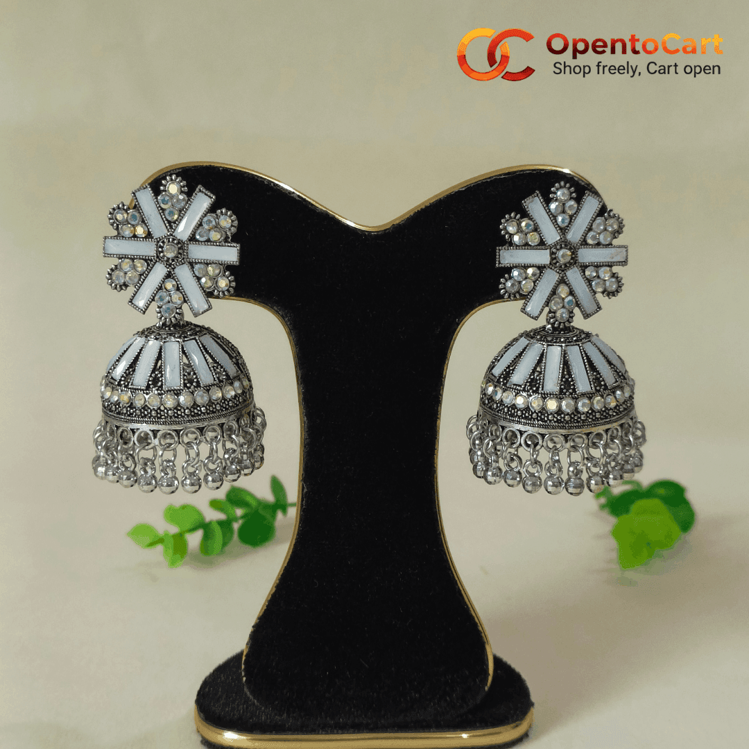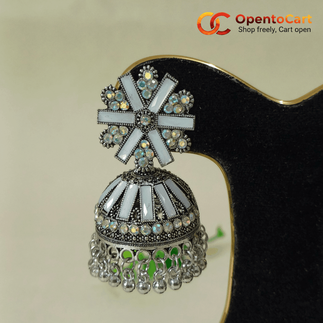 Premium White Stone Studded Oxidized Jhumka Earrings – Traditional Silver Polish Party Wear for Women